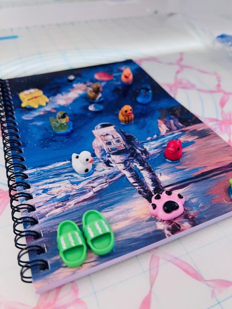 Decoden Notebook: Sprinkle on the charm and express your creativity with Decoden Japanese Crafting. Decoden is a movement all about decorating items with kawaii (cute) things such as candy charms, whipped cream, pastel colors, and of course, chibi (small) animals. These items are layered to create a preppy, maximalist, top-layered look.  It was originally known as “keitei art,” but became known as Decoden later.